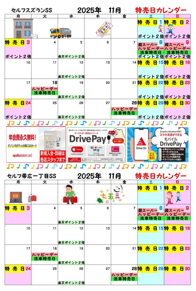 ♪セルフスタンドからのお知らせ♪ セルフスズランSS & セルフ帯広一丁目SS 11月特売日カレンダーです。 ※予告なく変更及び中止する場合がございます。