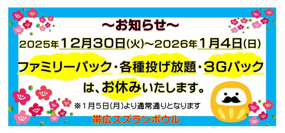 2025年12月30日(火)~2026年1月4日(日)の間、 一般向けパックプラン「3ゲームパック」「ファミリーパック」「投げ放題パック」をお休みさせていただきます。 2026年1月5日(月)より通常通り再開いたします。宜しくお願い申し上げます。