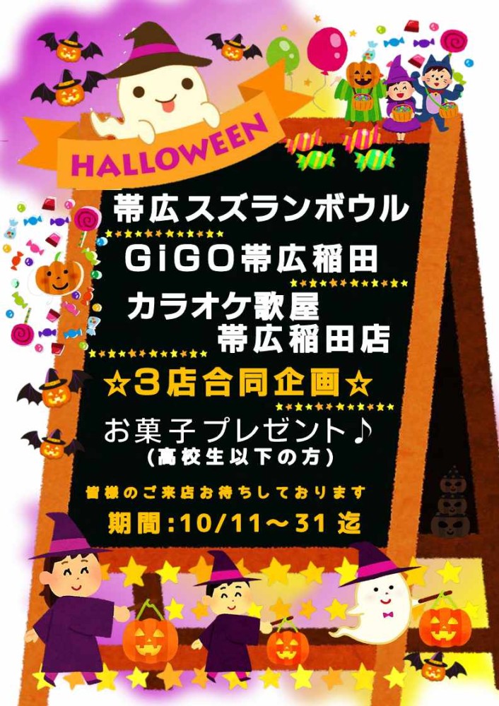 帯広スズランボウルでは、10/11(土)~10/31(金)の間ご来場されました高校生以下の方にお菓子をプレゼントいたします! 皆様のご来場を心よりお待ちしております!