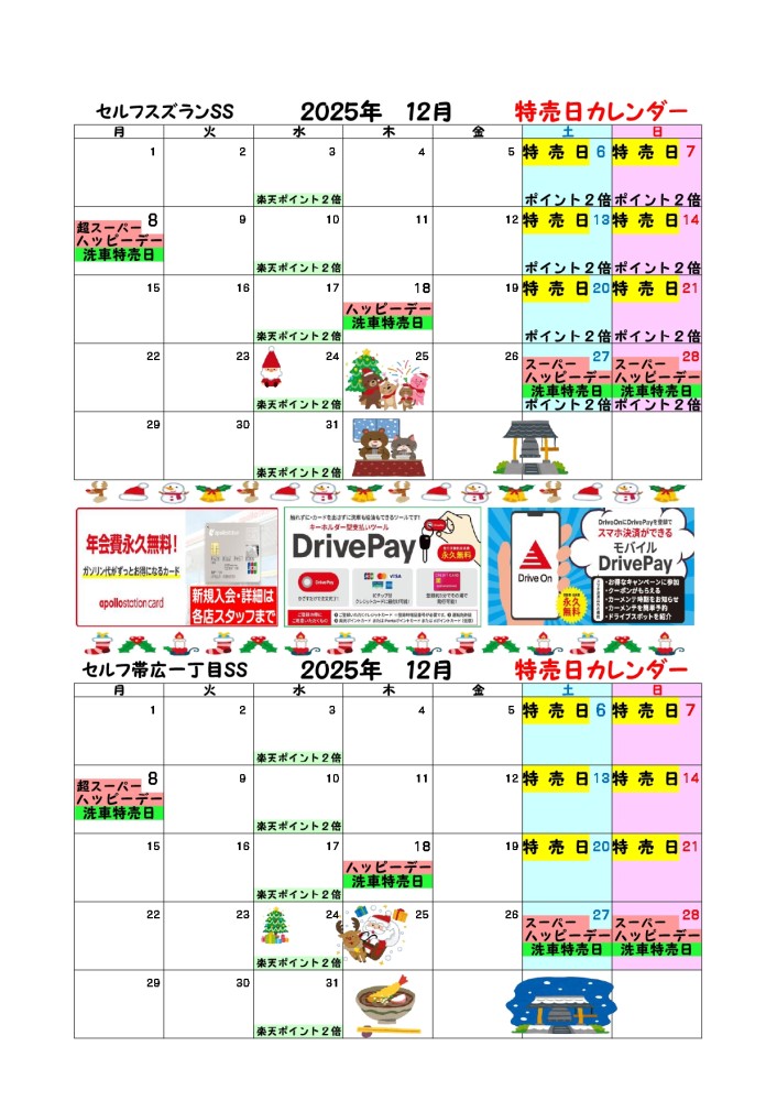 ★セルフスタンドからのお知らせ★ セルフスズランSS & セルフ帯広一丁目SS 12月特売日カレンダーです。 ※予告なく変更及び中止する場合がございます。