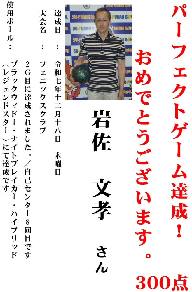 岩佐 文孝 様がパーフェクトゲームを達成されました。